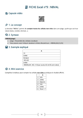 =NBVAL(A1 :A5) → 3 (car seules A2 et A5 sont vides)