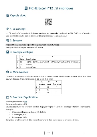 2 16 =SI(A2>=15;"Très bien";SI(A2>=10;"Bien";"Insuffisant")) → Très bien