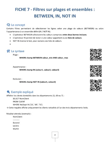 • L’opérateur BETWEEN sélectionne les valeurs comprises entre deux bornes incluses.